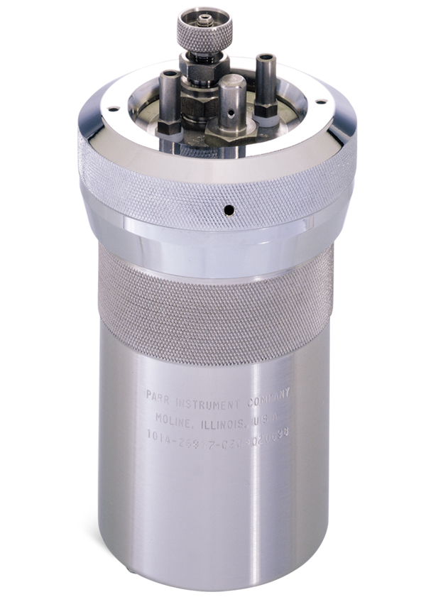 The 22 mL 1109A Semi-micro vessel is the smallest Parr Combustion Vessel. It will handle samples that range from 25 to 200 milligrams, liberating 52 to 1200 calories when burned in oxygen, using initial pressures up to 35 atmospheres. Outputs of up to 2400 calories can be accommodated if the sample is self-oxidizing, provided it is burned in an inert atmosphere and does not produce gas.