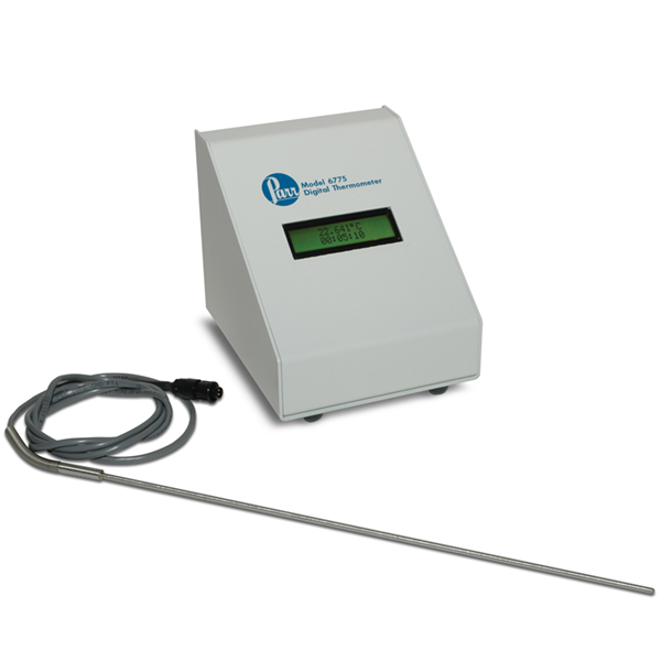 The 6775 Digital Thermometer provides digital precision and reliability for temperature measurements. Designed for use with the Parr 1341 Plain Jacket Calorimeter, the working temperature range is 10 to 40 degrees Celsius.
