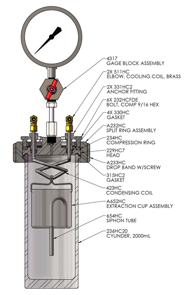This apparatus is used to test magnet wire used in hermetic applications. The test method determines the percentage of insulation on film insulated magnet wire that can be extracted by refrigerants or related solvents. The extractable material is functionally important since this material may be re-deposited in the capillary tubes of refrigeration systems. In this test, the specimen is subjected to extraction by a specified refrigerant. The extraction procedure is conducted for six hours in a pressurized vessel equipped with a 450 mL siphon cup. The 2 liter vessel is charged with 700 g of refrigerant. The temperature of the vessel and the flow rate of water through the condensing coil are adjusted to achieve a reflux rate of 15 to 25 cycles per hour. A sudden decrease in pressure is noted at the end of each cycle as the siphon cup empties. At the conclusion of the test, the refrigerant is evaporated and the mass of residue is determined.