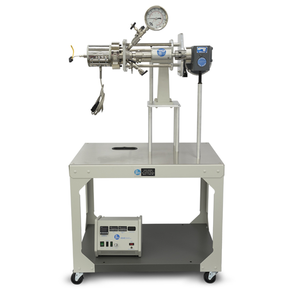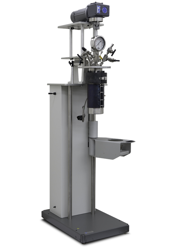 The 4578 Pressure Reaction System shown at center left is a 1.8L, fixed head reactor mounted on a floor stand and is rated for temperatures up to 500 °C with a maximum pressure of 5000 psig. The system was designed to operate in either the vertical or horizontal position.