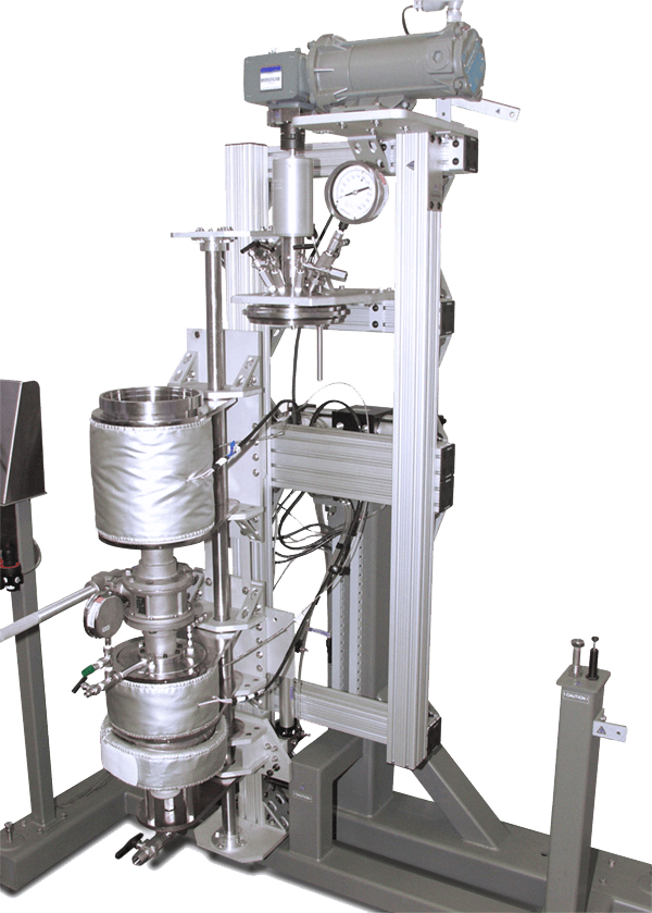 The horizontal function is also available on our large capacity reactor systems. The reactor shown on the left has a five gallon capacity and is used for stirring vertically or horizontally. Pneumatic controls on the left can tilt the system upright to open the bottom drain valve. The product is filtered and collected in the lower heated sample collection vessel. This system is used for producing synthetic fabric from biomass as an alternative to a petroleum-based process.